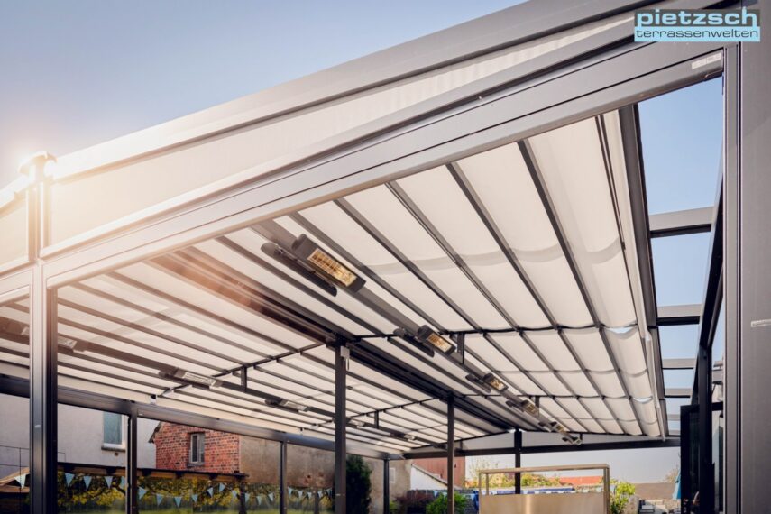 Mit diesem modernen Glasdach und der integrierten Unterglasmarkise steht dem entspannten Outdoor-Genuss nichts mehr im Weg.